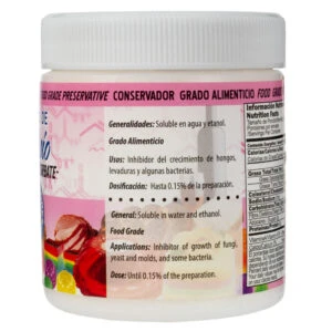 Conservados grado alimenticio, ideal para prolongar la vida de anaquel, inhibidor del crecimiento de hongos, levaduras y algunas bacterias